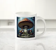 Tranquilla scena di foresta con alberi alti con foglie autunnali vivaci, grandi funghi rossi con macchie bianche circondati da erba e rocce e un'atmosfera nebbiosa con alberi di conifere lontani.