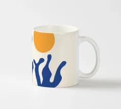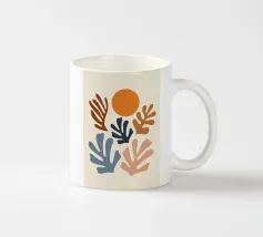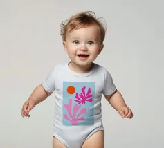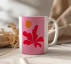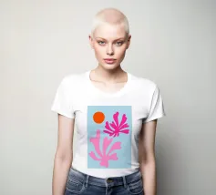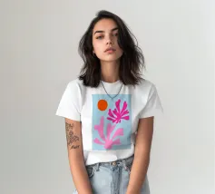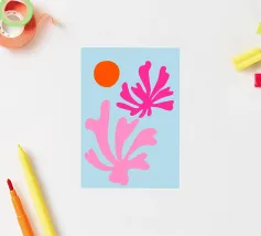 arte botanica astratta, forme moderne di piante, foglie di corallo rosa, illustrazione del sole arancione, sfondo blu pastello, design floreale minimalista, natura astratta contemporanea, grafica fogliare giocosa, opera d'arte dalle forme audaci, stampa ispirata a Matisse, atmosfera moderna tropicale, flora astratta vibrante