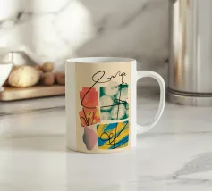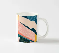 Forme geometriche audaci in blu, giallo e rosa contrastano con uno sfondo neutro. Ombre organiche e punti colorati creano una composizione dinamica e astratta.