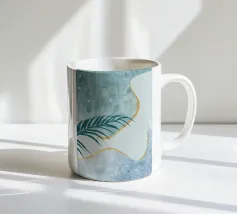 Un'opera d'arte astratta e rilassante che presenta una composizione di forme organiche e fluide in una tavolozza tenue di blu, verde e beige, accentuata da un'unica linea dorata. L'opera è serena, minimalista e sofisticata.