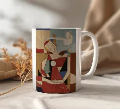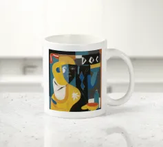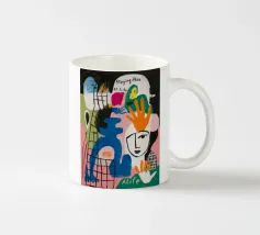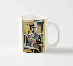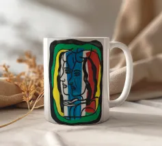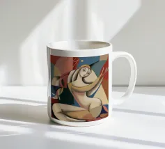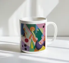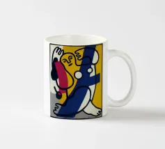 Questo dipinto mostra una composizione astratta con un mix di forme geometriche e organiche. I colori sono decisi e comprendono il nero, il blu, il rosso e il bianco. Le forme si sovrappongono e creano un senso di profondità.