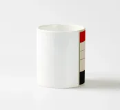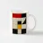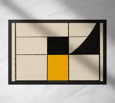 Una composizione geometrica presenta una griglia di rettangoli e quadrati nei toni del rosso, giallo, nero e beige. Il design ha un'estetica minimalista con un'importante sezione curva.