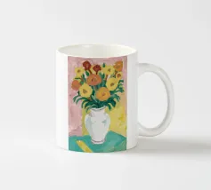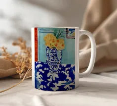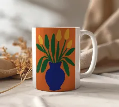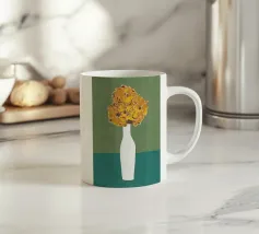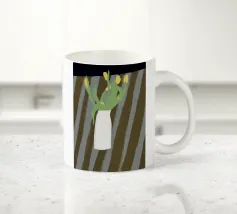 Un'elegante illustrazione di natura morta incentrata su un vaso di vetro trasparente che contiene fiori bianchi e gialli. La composizione è definita da una lunga e drammatica ombra blu proiettata dal vaso, che suggerisce una forte fonte di luce e aggiunge un senso di tempo e di tranquilla drammaticità alla scena.