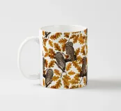 Gufi nella quercia autunnale; disegno senza cuciture dipinto a mano