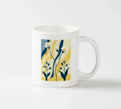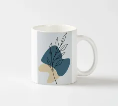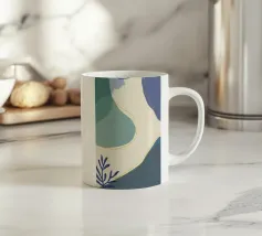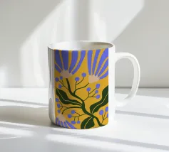Un ramo stilizzato con foglie e bacche si staglia su uno sfondo astratto di forme blu, verdi e gialle. Le forme fluide e le morbide sfumature di colore danno un senso di armonia e di calma.