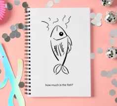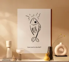 Questa illustrazione giocosa presenta uno schizzo eccentrico di un pesce con un tocco umoristico. Il suo design minimalista in bianco e nero, abbinato alla domanda audace "Quanto costa il pesce?", invita alla curiosità e al sorriso. La combinazione di semplicità e umorismo rende quest'opera d'arte un perfetto spunto di conversazione per qualsiasi spazio moderno.
