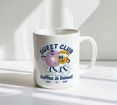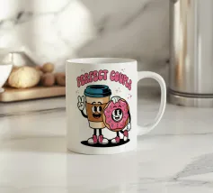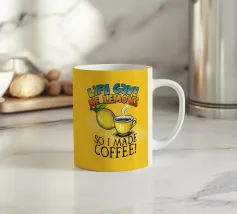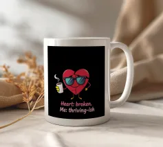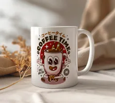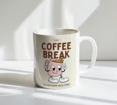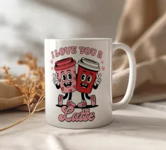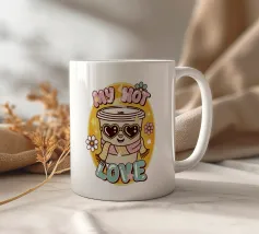 Una tazzina da caffè e un personaggio a forma di cuore sono raffigurati mentre si tengono per mano con la scritta "Ho bisogno di una sola cosa per riscaldare il mio cuore, il caffè".