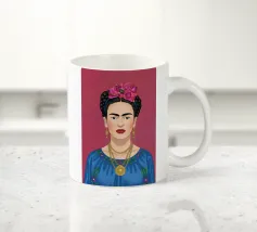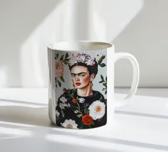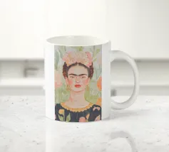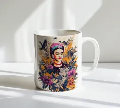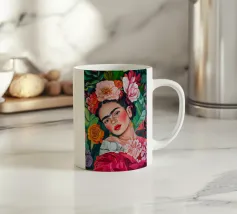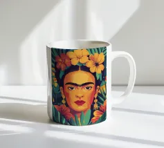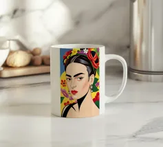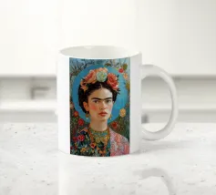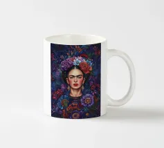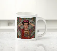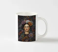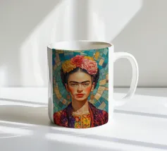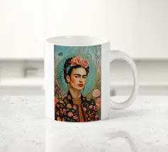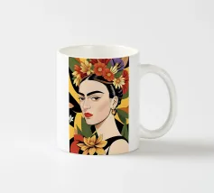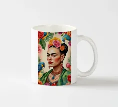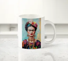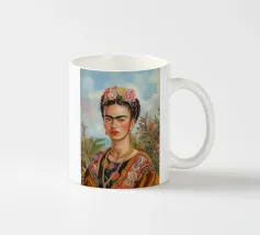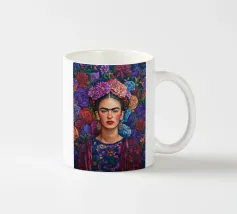 Questo vibrante ritratto di Frida Kahlo la ritrae in costume tradizionale messicano con una colorata corona di fiori che incarna il suo legame con il folklore e il simbolismo femminista.