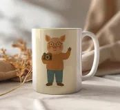 Aggiungete un tocco morbido e caldo al vostro arredamento con questo poster che raffigura un simpatico maialino occhialuto con un maglione arancione che tiene in mano una macchina fotografica.