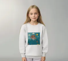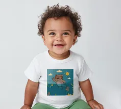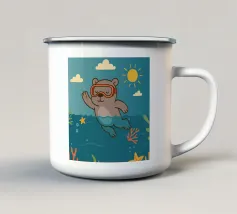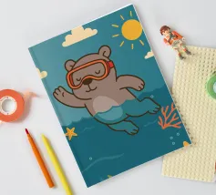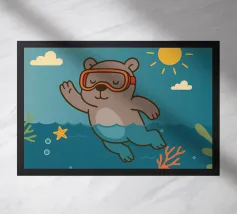 Simpatico orso con occhiali da sub che nuota nel mare. Scena subacquea giocosa con coralli e stelle marine. Perfetto per disegni per bambini, prodotti estivi e illustrazioni marittime.Orso allegro con maschera da snorkeling Mondo sottomarino colorato con sole Design infantile e giocoso Ideale per motivi estivi, marini e animali Perfetto per poster, abbigliamento...