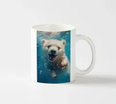 Questo dipinto raffigura un orso polare che si tuffa in acque scintillanti. Le bolle circondano l'orso mentre il sole splende luminoso, evidenziando la gioia e la libertà del momento.
