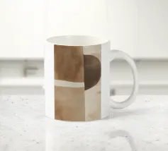 Una coppia di forme astratte domina la composizione in una combinazione di colori a due toni, evocando uno stile modernista. Le forme sono rese con bordi morbidi e una miscela di toni terrosi, creando un senso di calma ed equilibrio.