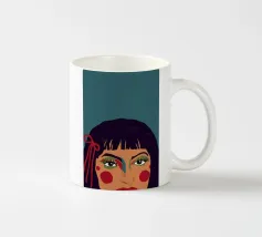 Un ritratto grafico di grande impatto di una donna con un'acconciatura nera e labbra rosse, con lo sguardo intenso rivolto all'osservatore, su uno sfondo colorato e astratto.