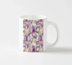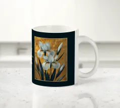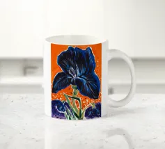 Una rappresentazione dettagliata e vibrante di un singolo fiore di iris in piena fioritura, che mostra i suoi intricati petali nei toni del blu, del viola, del bianco e del giallo. L'attenzione si concentra sulla maestosa bellezza del fiore.