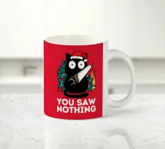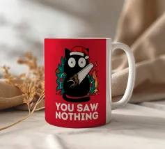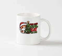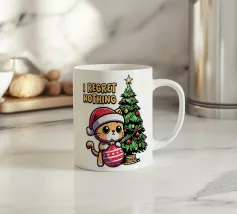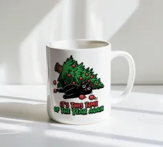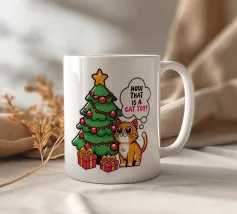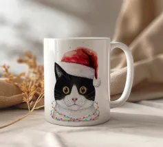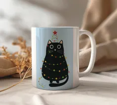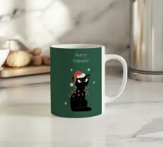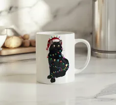 Un gatto nero che indossa un cappello da Babbo Natale è spiritosamente impigliato in luci natalizie colorate. Il testo accanto al gatto recita: "È abbastanza allegro?".