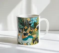 Una persona è seduta su un'altalena in mezzo a piante e fogliame verde. Il loro spirito giocoso è esaltato da un abito a scacchi e da un cappello a tesa larga, che sottolineano l'avventura.