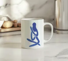 Una spessa linea blu serpeggia su uno sfondo neutro, creando un motivo astratto dalle forme audaci e curvilinee. La semplicità del disegno enfatizza il movimento e il flusso della linea continua.