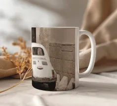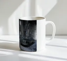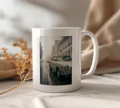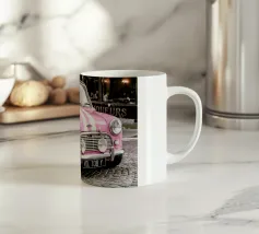 In una pittoresca strada di Londra, un'elegante auto d'epoca passa davanti a facciate di mattoni con un'atmosfera retrò e senza tempo dell'architettura britannica, mescolando storia e nostalgia urbana.