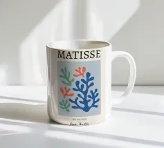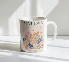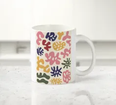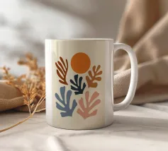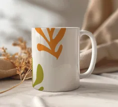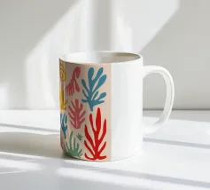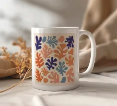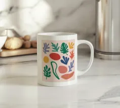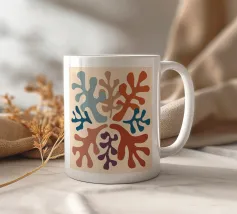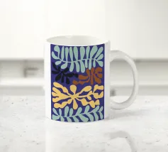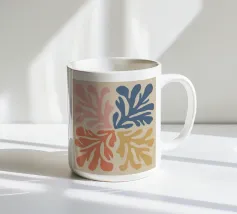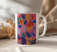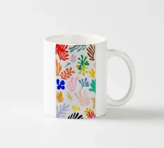 Un motivo di foglie stilizzate nei toni del verde, del rosa e della terracotta, ispirato ai ritagli di Henri Maraoui. La disposizione suggerisce una danza aggraziata di forme botaniche.
