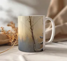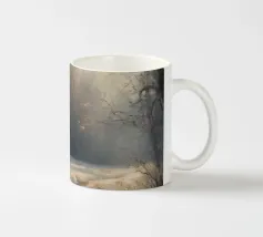 Una tranquilla mattina d'inverno si dispiega in questo dipinto d'atmosfera: un sentiero innevato nella foresta conduce attraverso alti abeti ricoperti di brina. La luce delicata del sole nascente filtra attraverso gli alberi e inonda il paesaggio di un caldo bagliore dorato. Le tracce sulla neve raccontano il movimento nella quiete: natura, pace e luce si combinano per creare un armonioso idillio invernale.
