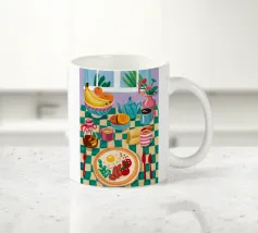 Una deliziosa tavola imbandita per la colazione vista dall'alto. Una pila di pancake dorati, una tazza di caffè, fette di pane, marmellata e frutta fresca sono disposti ad arte su una superficie con una tovaglia o una tovaglietta a scacchi bianchi e blu.