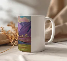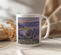 Un dipinto paesaggistico espressivo raffigura un fiume che serpeggia in una valle con alberi dalle tonalità autunnali o crepuscolari di rosa, arancione e viola, sotto un cielo drammatico e colorato, che evoca una scena lunatica e vibrante.