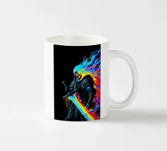 Questa cupa raffigurazione mostra il Tristo Mietitore in un'aura gelida, quasi spettrale. Avvolta in un lungo mantello a brandelli, la sua forma scheletrica si staglia minacciosa da un turbine di nebbia fredda. Il cappuccio nasconde solo parzialmente il suo volto, rivelando un teschio spettrale con occhi luminosi. La sua mano ossuta regge un'imponente falce, la cui lama sembra fatta di ghiaccio spezzato e brilla minacciosamente. Frammenti di ghiaccio fluttuano intorno ad essa, conferendo al motivo un brivido mistico.