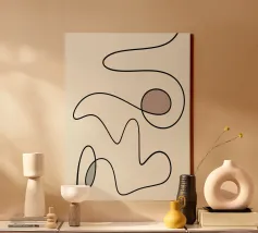 Un design minimalista caratterizzato da una linea nera continua che crea forme astratte su uno sfondo beige, con sottili tocchi di marrone e grigio. La composizione suggerisce movimento ed equilibrio attraverso curve e cerchi fluidi.