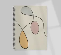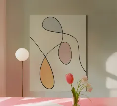 Forme astratte in tonalità tenui sono collegate da linee nere scorrevoli, creando una composizione minimalista. Lo sfondo è di un beige tenue, che esalta la delicatezza dei colori pastello.