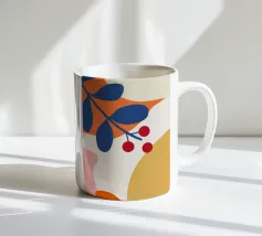 Un disegno botanico minimalista presenta un ramo bianco delineato con foglie. Linee curve e forme organiche nei toni del blu, del verde e del giallo creano uno sfondo moderno e astratto.