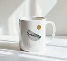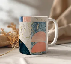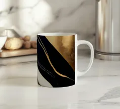 Una composizione moderna presenta un mix di motivi di marmo, granito e terrazzo, intersecati da una sottile linea orizzontale dorata. Le forme geometriche creano un'estetica strutturata e architettonica con toni e texture contrastanti.