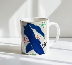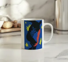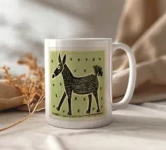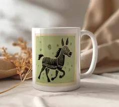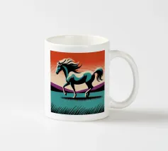Quest'opera d'arte presenta un cavallo nero stilizzato in forma grafica e audace su uno sfondo neutro. Circondato da semplici foglie verdi astratte e da forme celestiali simili a stelle, il pezzo ha una qualità mitica e primordiale. La composizione minimalista enfatizza la potente silhouette del cavallo.