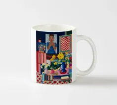 Il classico momento del caffè viene immortalato con un'alta caffettiera rossa e una tazza rosa su una tovaglia a scacchi gialla e bianca, su uno sfondo blu intenso, creando una scena accogliente e colorata.