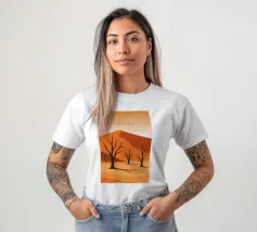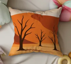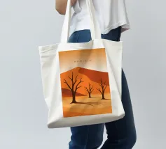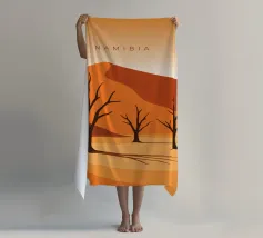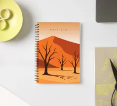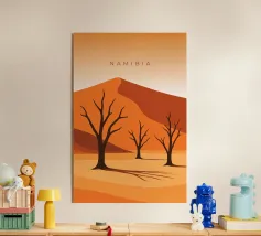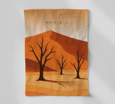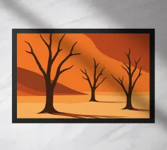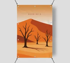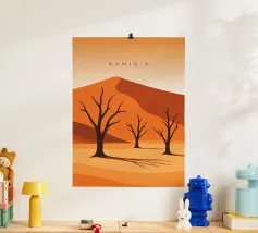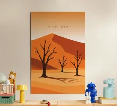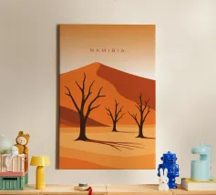 Disegno di viaggio minimalista della Namibia con Deadvlei o Sossusvlei nel Namib. Questo motivo tipico del paesaggio africano è perfetto per tutti i viaggiatori della Namibia che amano le dune di sabbia e i pittoreschi alberi di cammello.