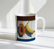 Una natura morta realistica ma stilizzata di una papaya e una banana su una superficie bianca, immersa in una forte luce solare diretta. Il gioco di luci e ombre lunghe crea una composizione drammatica e moderna.