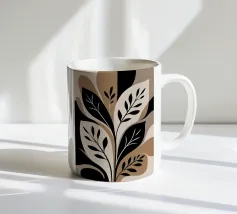 Un disegno botanico stilizzato presenta foglie nere e crema su uno sfondo caldo e abbronzato. Il contrasto tra gli elementi scuri e quelli chiari mette in risalto le forme semplici e suggestive delle foglie.
