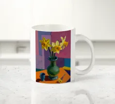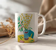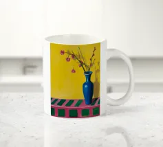 Un vaso blu di fiori gialli risplende davanti al dipinto di un tramonto dorato, fondendo natura e arte in toni radiosi.