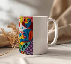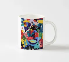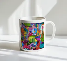 Un paesaggio surreale pieno di figure astratte, animali e forme geometriche. L'uso dinamico di colori vivaci e disegni intricati evoca immaginazione e curiosità.