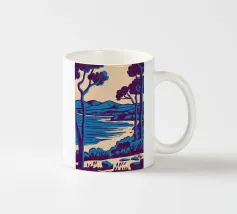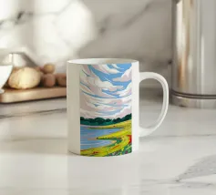 Raffigura un paesaggio tranquillo con uno specchio d'acqua in primo piano. Erbe alte e canne costeggiano l'acqua. Al centro, alberi dal tronco rosato e dal fogliame verde. Lo sfondo è caratterizzato da colline ondulate nei toni dell'arancione, del giallo e del verde, con un cielo blu e nuvole bianche in alto.