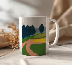 Un paesaggio tranquillo è caratterizzato da una serie di campi colorati con una figura solitaria che cammina lungo un sentiero. Sullo sfondo, morbide colline verdi e una fila di alberi creano un'atmosfera serena.