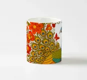 Una lussureggiante illustrazione di un pavone e di un bouquet di fiori rosso-arancio. Una tavolozza calda ed estiva, ideale per creare un'atmosfera botanica e di tendenza nella vostra casa.
