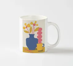 Un vaso a righe bianche e blu contiene fiori gialli e rosa, su uno sfondo vibrante, simile a una trapunta, con motivi floreali rosa, arancioni e rossi.
