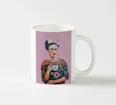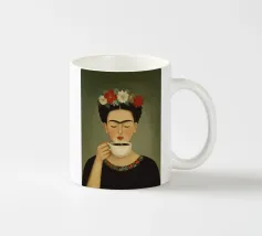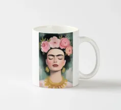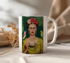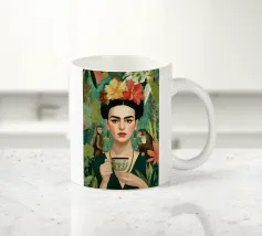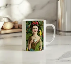 Frida Kahlo gusta il suo caffè in una tazza di fiori, circondata da elementi botanici e accenti floreali. Il suo autoritratto emana eleganza e stile boho, mentre i verdi tenui e i toni della terra sottolineano la sua bellezza naturale.