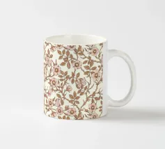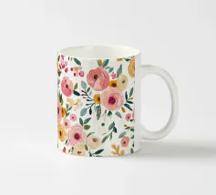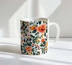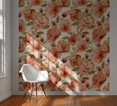 Uno splendido motivo floreale acquerellato con fiori color corallo, pesca e salmone e foglie verde salvia su un caldo sfondo crema.