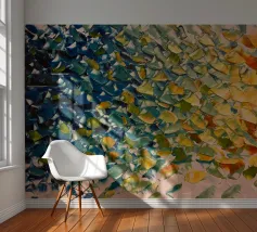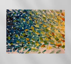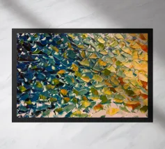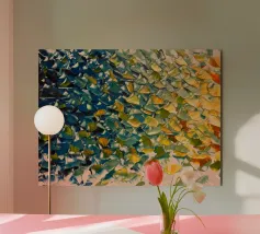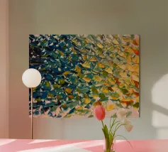 Il dipinto è colorato, con un mix di rosso, blu, giallo e verde. I toni accesi creano un'atmosfera gioiosa ed energica che cattura immediatamente l'attenzione.