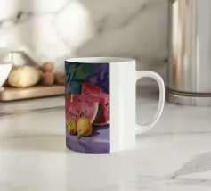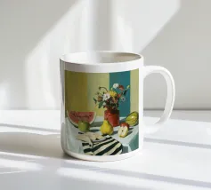 Una giocosa natura morta con una grande fetta di anguria, una brocca bianca, banane e una mela su una superficie a scacchi verdi e bianchi. La composizione utilizza audaci colori primari su uno sfondo scuro per un effetto grafico di grande impatto.