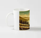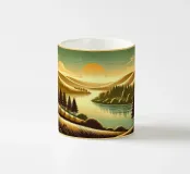 Poster di viaggio vintage di un fiume tranquillo all'alba con acqua dorata, nebbia mattutina, rive alberate, punte di canne lungo la riva e colline lontane in una luce soffusa. Forme geometriche pulite, una sottile texture della carta e una tavolozza di paglia, muschio e ardesia creano una stampa naturalistica senza tempo ideale per soggiorni, camere da letto, studi e arredi moderni.