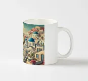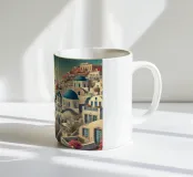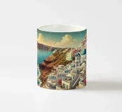 Poster di viaggio vintage di Santorini, Grecia, con case bianche sulla scogliera, cupole blu, strette scale e terrazze, una tranquilla baia dell'Egeo all'interno della caldera, piccole imbarcazioni sottostanti e una tenue foschia al tramonto. Le forme geometriche pulite, la sottile texture della carta e la tavolozza luminosa delle isole creano una stampa mediterranea senza tempo, ideale per soggiorni, camere da letto, arredamento costiero e spazi per le vacanze.