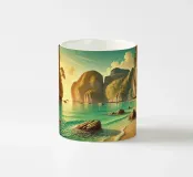 Poster di viaggio d'epoca delle isole Phi Phi in Thailandia, con una spiaggia sabbiosa curva, una laguna tra lo smeraldo e il turchese, imponenti scogliere calcaree, piccole grotte nella roccia, massi arrotondati sul litorale e barche longtail ancorate sotto la morbida luce del mattino. Forme geometriche pulite, una sottile texture della carta e una tavolozza di sabbia, corallo e blu marino creano una stampa senza tempo sul Mare delle Andamane, ideale per soggiorni, camere da letto, case al mare e decorazioni costiere.