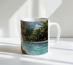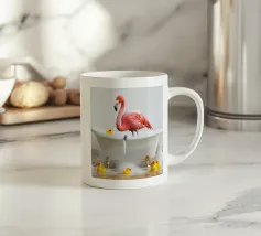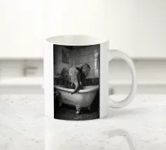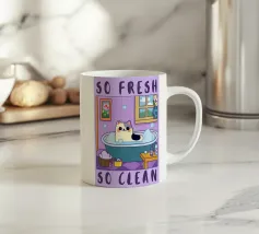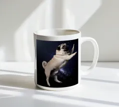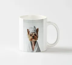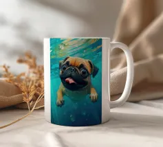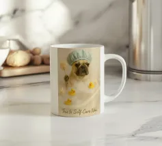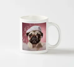 Un carlino siede in una vasca da bagno piena di bolle, circondato da piastrelle blu chiaro e da un rubinetto argentato. L'espressione del cane è allo stesso tempo carina e un po' triste mentre si fa il bagno.